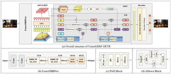 Overall structure of the FasterGDSF-DETR: (a) FasterGDSF-DETR; (b) FasterDBBNet; (c) PAD Block; and (d) ADown Block.