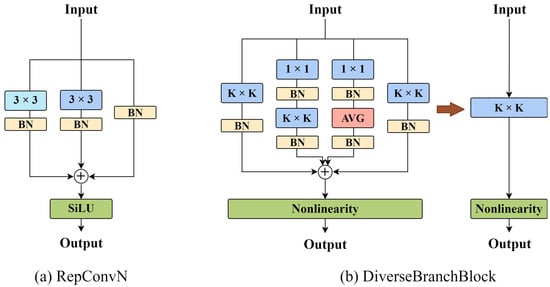 Building on the RepNCSPELAN4 module, we further replaced RepConvN with the Diverse Branch Block (DBB) [], as shown in Figure 2. Utilizing a multi-branch structure that integrates pathways of differing scales and computational complexities, DBB augments the feature learning capacity of a single convolution, thereby increasing the heterogeneity of the learned feature space. The convolution process and its corresponding output channels can be formulated as shown below, with ⊛ signifying the convolution operator: