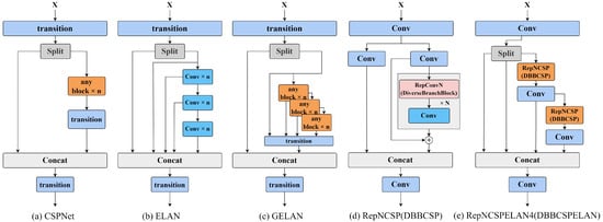 DBBCSPELAN is deconstructed into CSPNet, ELAN, GELAN, and DBB. (a) CSPNet. (b) ELAN. (c) GELAN. (d) RepNCSP and DBBCSP are two structures, and in the figure, brackets are used to indicate the use of different modules.