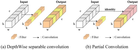 Partial convolution introduces a distinct mechanism for spatial feature learning. The model performs standard Conv in a limited number of input channels, selectively bypassing others. This method, which assumes the convolved subset captures representative features, differs fundamentally from grouped or depthwise separable convolutions, whose main goal is to diminish parameters and FLOPs through filter redundancy. To avoid degradation into standard convolution, the remaining unfiltered channels are retained, allowing feature information to flow through all channels.