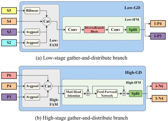 To mitigate the information degradation often encountered during feature propagation in conventional FPN architectures, we redesigned the encoder structure by incorporating the Gather-and-Distribute (GD) mechanism. The fundamental principle is to centralize the collection and integration of information from all hierarchical levels within a unified module. Subsequently, this fused information is disseminated back across different levels, enhancing the model’s ability to effectively represent objects at various scales. The GD mechanism operates via two parallel pathways, as follows: a low-stage gather-and-distribute branch employing convolution-based blocks and a high-stage counterpart utilizing attention-based blocks for feature extraction and fusion. Each branch integrates both a Feature Alignment Module (FAM) and an Information Fusion Module (IFM). Furthermore, a computationally efficient injection module is introduced to facilitate local feature transfer, specifically between adjacent levels.