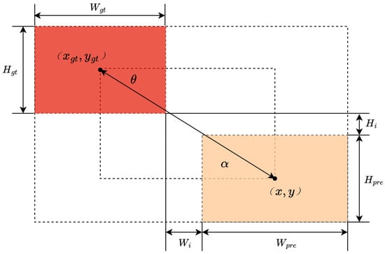 where represents the IoU loss function; and denote the width and height of the overlapping area between the ground truth and predicted boxes; and represents the union area. The parameters are illustrated in Figure 7.