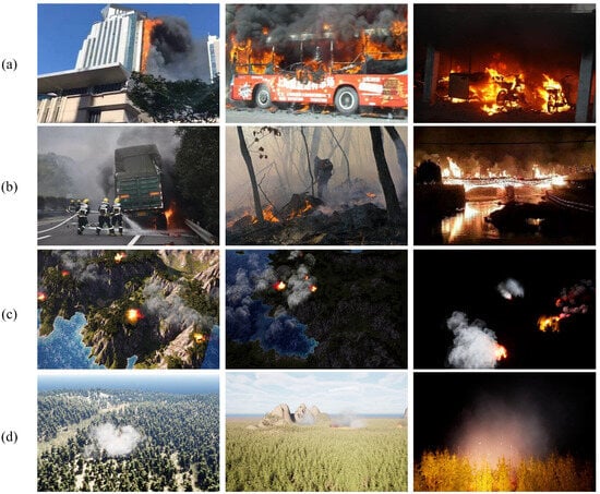 To enhance methodological rigor and empirical validity, we conducted comprehensive experimental evaluations using the open source M4SFWD [] dataset. Developed using Unreal Engine 5, this synthetic dataset enables the photorealistic generation of diverse forest wildfire scenarios, unconstrained by temporal or spatial limitations. The dataset’s comprehensive coverage encompasses the following: eight distinct natural environments with varied terrain features, three temporal phases (dawn, daylight, and dusk), multiple meteorological conditions, and some negative samples to enhance model robustness and reduce false positives. Comprising 3974 high-resolution images with 9627 annotated flame instances, the dataset was randomly partitioned into training, testing, and validation subsets following an 8:1:1 ratio, ensuring statistically reliable results through stratified sampling across all environmental variables.