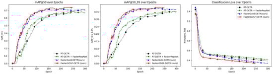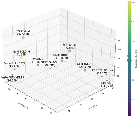 Evidence supporting the superiority of our proposed models over the original RT-DETR algorithm can be found by examining Experiments 1, 8, and 9, detailed in Table 1. The enhanced performance observed in our approach stems from a configuration utilizing the FasterRepNet backbone network, the AIFI-GD hybrid encoder for feature integration, and the substitution of the default CIoU loss function with WIoUv3. The resulting FasterGold-DETR model improved the mean average precision (mAP50) by 2.6% while reducing the parameters and GFLOPs. On this basis, the FasterGDSF-DETR model introduced DBB modules into both the backbone and encoder, and it integrated the SSFF module into the feature fusion layer, creating the new AIFI-GDSF encoder. Although the parameter count slightly increased, the computational complexity was significantly reduced, and the mean average precision saw a slight improvement.