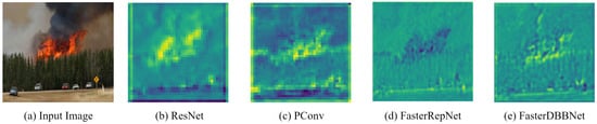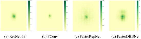 In this study, an Effective Receptive Field (ERF) visualization method is employed to analyze the backbone network, explaining the performance enhancements resulting from the replacement of the backbone network []. Figure 11 illustrates that, in ResNet-18, high-contribution pixels are concentrated around the central region, while those extending towards the periphery contribute minimally, with outermost pixels exhibiting almost no impact. This pattern suggests a constrained Effective Receptive Field (ERF). A similar trend is observed when employing PConv, where contributions generally decrease, indicating that partial convolutions alone do not expand the ERF without additional network depth. In contrast, Figure 11c,d demonstrate a higher uniformity in the distribution of high-contribution pixels, thus indicating that the proposed FasterRepNet and FasterDBBNet architectures allocate greater importance to peripheral regions. This phenomenon consequently gives rise to a more balanced contribution distribution and an expanded ERF.