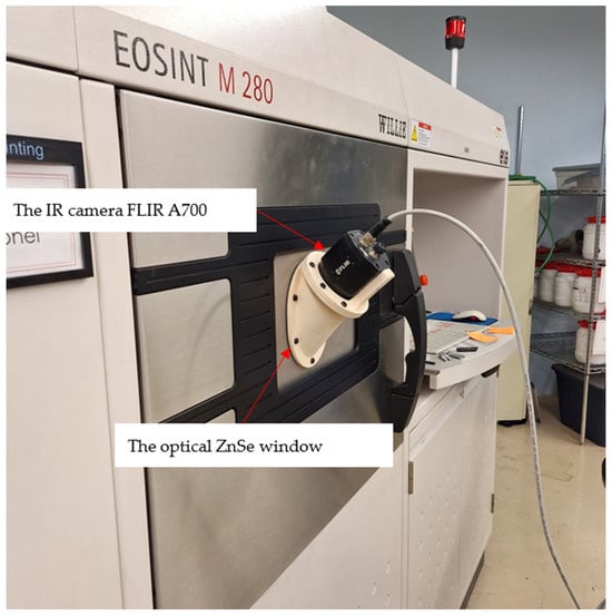 The laser melting process was examined within the build chamber of the EOSINT M280 system (Figure 1). The optical metrological window substitutes the standard window of the EOSINT M280 system. The ZnSe window enables the transmission of wavelengths ranging from 3 µm to 12 µm. Full technical details of the optical window are available on the manufacturer’s website []. The FLIR A700 infrared (IR) camera operates over a broad temperature range from 300 to 2000 °C, providing high measurement precision with an accuracy of ±2 °C or 2%, whichever is greater. The camera functions within a wavelength range of 7.5 to 14 µm and includes a dedicated output for generating a feedback signal [].
