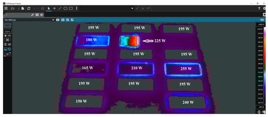 The FLIR Research Studio V2.0 software was applied to measure the sintering/melting temperatures of 316L steel powder at varying laser power levels. It was used to collect data on the peak temperature values for each layer of the produced component. A Kalman filtering algorithm was also implemented to estimate the temperature for each track. Figure 2 displays the visualization of the laser melting process for a single component layer at different power settings, captured with the FLIR A700 infrared camera and analyzed using the FLIR Research Studio software.