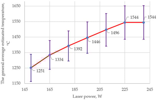 By substituting the calculated values of Type B uncertainties into Equation (4), the value of the combined Type B uncertainty was obtained, which amounted to 3.44%. Considering the maximum estimated temperature value of 1544 °C and the relative combined Type B uncertainty of 3.44%, the maximum absolute value of the combined measurement uncertainty of the melting temperature of 316L steel powder, caused by the limitations of the properties of the equipment used, was . Taking into account the estimated values of the measured temperatures at different laser powers (Figure 3), absolute values of combined uncertainties of type B were calculated considering the average values of the sintering/melting temperatures of 316L steel powder at each studied laser power (Table 1).