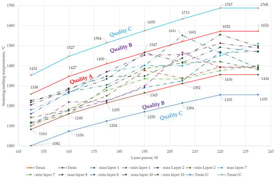 The satisfactory quality level (B) (Figure 4) was defined based on a temperature range calculated using the relative expanded uncertainty applied to the lower (−7%) and upper (+7%) boundaries of quality level A. Specifically, this range includes an increase of 7% above the maximum allowable temperature Tmax + U and a decrease of 7% below the minimum allowable temperature Tmin − U at specified laser power levels. The unsatisfactory quality level (C) was assigned to cases where the sintering/melting temperatures exceeded the range defined by Tmin − U and Tmax + U (Figure 4).