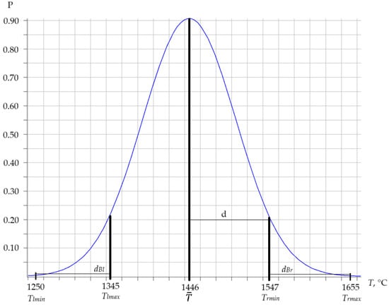 where represents the mean value of the temperature of multiple measurement results (estimated value of temperature); and are the allowable lower (minimum) and upper (maximum) temperature range values, within which the quality of the laser melting process is classified as good/high (A); T is the measured temperature value; TN is the true temperature value; d is tolerance field for the parameter [,,]: