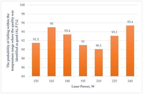 As illustrated in Figure 6, the probability of attaining high-quality (A) results in the laser melting process at the manufacturer-recommended laser power of 195 W for the EOSINT M280 system reached 91%. Meanwhile, the overall probability of achieving satisfactory quality (B) for the 316L steel powder melting process was just 0.03% (Table 2). These findings indicate that the process maintains a consistently high-quality level (A), suggesting a strong probability of manufacturing a final component with excellent quality. This probabilistic assessment of the laser melting process can be utilized as a key metric for evaluating the overall quality of the finished part.