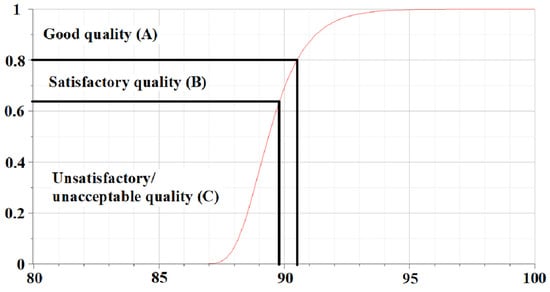 Based on the commonly accepted quality assessment criteria shown in Figure 7, a good quality level (A) corresponds to a probability range of 90.5% to 100%, which translates to quality levels from 0.8 to 1 (0.8 ≤ D ≤ 1). A probability range from 89.78% to 90.49% corresponds to a satisfactory quality level (B), which is identified with a quality level in the range of 0.63 to 0.8 (0.63 ≤ D < 0.8). Probability values below 89.77% are classified as unsatisfactory/unacceptable quality (C), with a desirability level lower than 0.63 (D < 0.63).