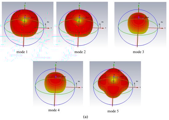Figure 3 presents the far-field radiation patterns of the antennas in various working modes. Figure 3a shows the radiation patterns corresponding to five modes for the conventional microstrip antenna, while Figure 3b illustrates the patterns for three modes of the pin-loaded antenna structure. The conventional microstrip antenna exhibits omnidirectional radiation characteristics in modes 1, 2, and 5. Specifically, under mode 1—that is, when the operating frequency was 2.45 GHz—the microstrip antenna operated in the TM22 mode. Similarly, the pin-loaded antenna structure achieves omnidirectional radiation when operating in mode 1, corresponding to the Quasi-TM11 mode.