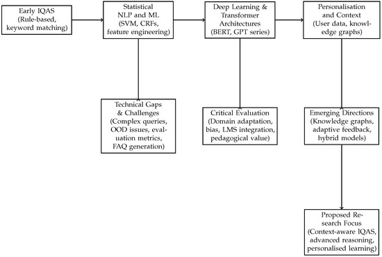 However, despite the promise of these tools, current iterations of IQASs often fall short of their potential. Many existing systems struggle to effectively decipher the nuances of natural language, particularly within the complex and dynamic context of student–teacher interactions [4]. Student queries, often imbued with colloquialisms, incomplete information, or implicit assumptions, pose a significant challenge to these systems. Consequently, responses may be inaccurate, irrelevant, or fail to address the underlying learning gap, leading to frustration and hindering the learning process. This limitation underscores the critical need for a more sophisticated IQAS that can accurately interpret and respond to a wide range of questions, taking into account the context of the query, the student’s learning history, and the specific educational content being addressed.