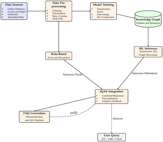 The novelty of this research lies in its holistic and multifaceted approach to creating an intelligent question-answering ecosystem tailored for personalised learning. Unlike traditional IQAS systems that primarily rely on keyword matching, our approach integrates a deep contextual awareness by considering students’ learning histories, previous interactions, and the specific educational content being studied. This results in responses that are not only accurate but also highly personalised. Moreover, the research leverages advanced NLP techniques—such as transformer models and deep learning architectures—to effectively capture and understand the nuances of natural language within educational discourse. The system is further enhanced by incorporating domain-specific knowledge, enabling it to provide precise answers to complex questions that demand a specialised understanding of the subject matter. In addition, a novel software tool is developed to automatically generate FAQs from educational materials, thereby offering personalised learning resources that support students and assist educators in developing comprehensive learning materials. By synergistically integrating the advanced IQAS with the automated FAQ generation tool, this research creates an environment that caters to both immediate query resolution and broader knowledge acquisition. Overall, this comprehensive approach has the potential to significantly enhance personalised learning, particularly when addressing complex or nuanced queries, and it represents a substantial advancement in the application of AI in education [13].