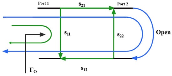 When Port 2 is open, , and when Port 2 is shorted, . By substituting the reflection coefficients of the fixture when Port 2 is either open or shorted into Equation (4), the following expressions can be obtained: