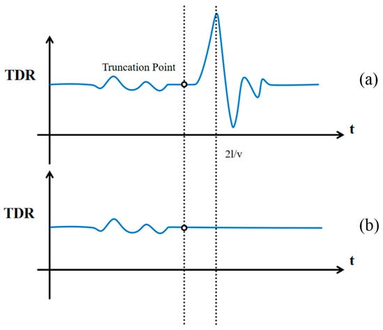 - Determine : Using the TDR time-domain sampling algorithm, the measured was transformed using the Fourier transformation, which was followed by the time-domain truncation process, and then, the inverse Fourier transformation was conducted to obtain . The resulting was compared with the directly simulated , as shown in Figure 13.