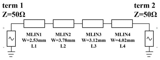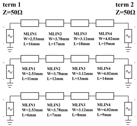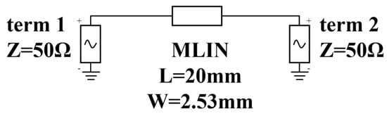 This study conducted a simulation verification of the applicability of the lossless assumption. The total length of the microstrip lines was defined as a length variable and set to 30, 50 and 70 mm. The dielectric loss tangent (DF) was regarded as a variable. The simulation circuit diagram is shown in Figure 8.