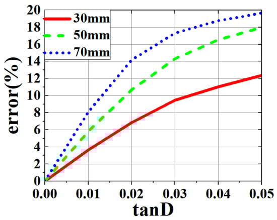 Figure 9 shows the error distribution for different combinations of the DF and microstrip line’s length. The results indicated that as the DF or the microstrip line’s length increased, the percentage error increased significantly. Based on extensive experience in this field, it could be concluded that when the percentage error was less than 12%, the lossless assumption and the magnitude-symmetry formula Equation (13) could be considered valid [22]. It should be noted that most PCB fixtures used in practice can meet this limit, and for PCB fixtures with a common DF value of 0.02, the length is typically required to be as short as possible, so the lossless assumption is generally applicable to these PCB fixtures.