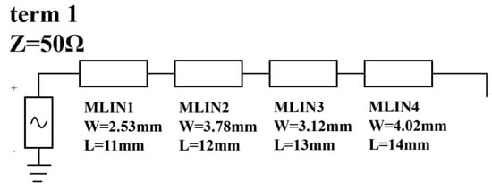 To observe the impact of discontinuities in impedance on the de-embedding algo-rithm’s performance, a series of four microstrip lines with inconsistent characteristic impedances were used as a fixture. In the simulation of this study, the fixture was set as a double-layer PCB, with the bottom layer as a ground. The relative dielectric constant was 3.66, and the substrate thickness was 0.5 mm. Four microstrip lines with widths of 2.53, 3.78, 3.12 and 4.02 mm were selected. The fixture is shown in Figure 7.