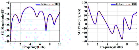 In Figure 13, the blue line represents the reflection coefficient obtained by direct simulations, and the red line indicates the reflection coefficient obtained by the TDR time-domain truncation algorithm. The error value depended on the measured frequency band, and the wider the frequency band and the larger the number of frequency points were, the smaller the error was.