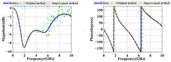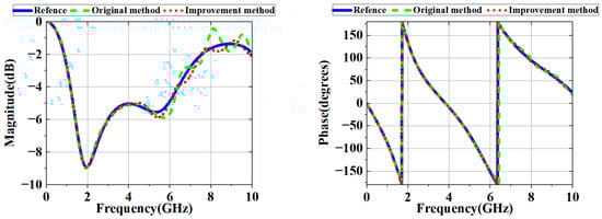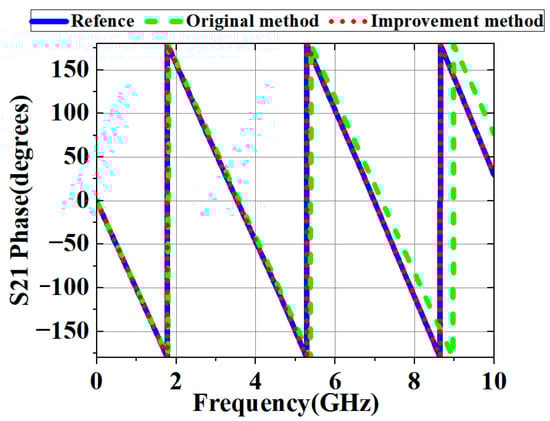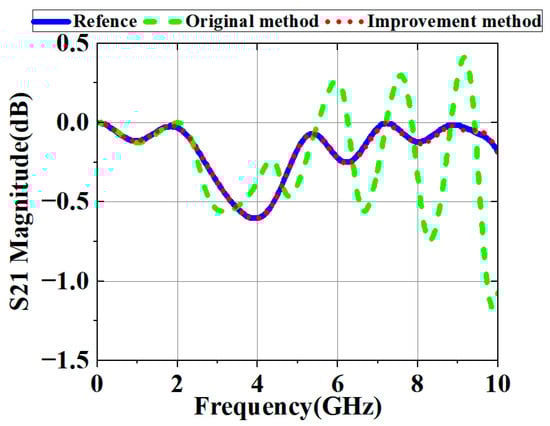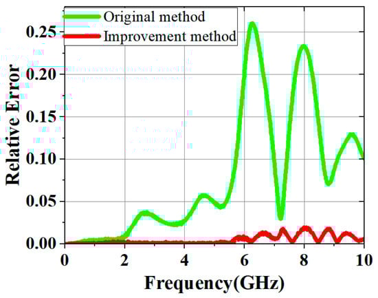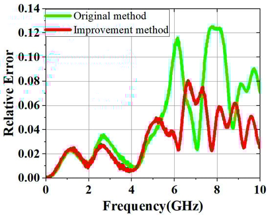 As shown in Figure 14, Figure 15 and Figure 16, the original method demonstrated high accuracy within the 2 GHz range. However, due to phase shift errors in and at high frequencies, even in the absence of loss, the original method had significant errors in at high frequencies. Under ideal lossless conditions, the improved method’s primary error source was time-domain truncation, such as signal truncation or noise interference.