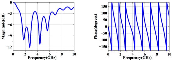 Since the magnitudes of and are the same but their phases differ, Equation (13) has been referred to in some studies as magnitude symmetry of a lossless reciprocal network or transmission line. The total phase delay from Port 1 to Port 2 can be calculated as follows: