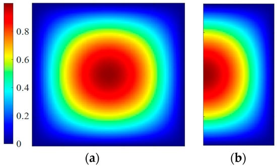 The resonant frequency () of the cavity with partially PMW surfaces is lower than that of the fully PEW cavity operating in the mode. To match the resonant frequency with that of the fully PEW cavity, the length () typically needs to be halved, which is a key feature of the HM dielectric-filled resonator design. Figure 2 shows the top-view electric field distributions for both the full-mode (FM) and HM resonators operating in the mode. It should be emphasized that the field distribution of the half-mode resonator is obtained under the PMW conditions.