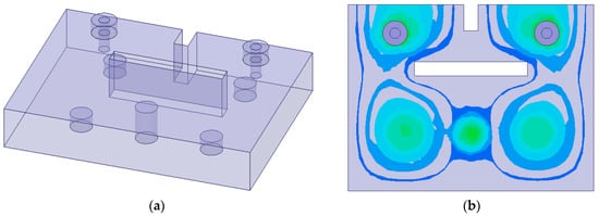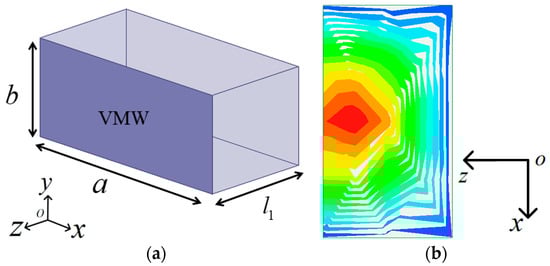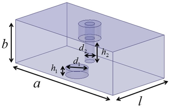 Theoretically, traditional rectangular dielectric-filled resonators can be constructed using a dielectric ceramic block with silver-coated surfaces. In this section, the silver-coated surfaces are modeled as perfect electric walls (PEWs), as shown in Figure 1a. The dimensions of the resonator are defined by its length (), width (), and height (). The resonant frequency of the cavity with these boundary conditions can be determined using the following formula [20]: