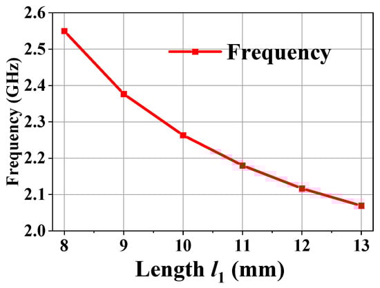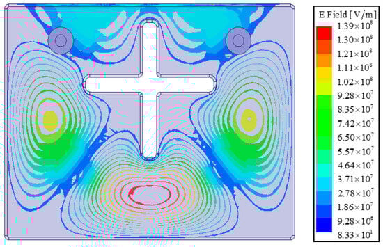 Figure 3 shows the configuration of the HM dielectric-filled resonator and its top-view electric field distribution of the mode. The relative permittivity of the ceramic is 20. Additionally, the loss tangent of the ceramic is determined to be 0.0005. The length () is approximately half of that of the FM resonator. All surfaces of the HM dielectric-filled resonator are silver-coated, except for the open apertures (OAs), which exhibit slight field leakage. The OA is identified as the virtual magnetic wall (VMW). The dimensions of the HM dielectric-filled resonator are optimized based on the resonant frequency of the FM dielectric-filled resonator. The electric field distribution is obtained through HFSS eigenmode simulations. An airbox is placed a 0.1 wavelength from the resonator surface, with its boundary conditions set as PEWs. Figure 4 presents the variation in the resonant frequency of the HM dielectric-filled resonator with respect to the length ().