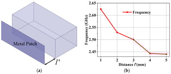 Due to the sensitivity of the OA to the surrounding environment, this work further investigates the effect of nearby metal patches on the resonant frequency of the HM dielectric-filled resonator. Figure 5a shows the configuration of the HM dielectric-filled resonator with a metal patch. The variable denotes the distance between the metal patch and the OA of the resonator. Figure 5b illustrates the resonant frequency of the HM resonator with metal patches at varying distances. As increases, the resonant frequency gradually decreases and eventually stabilizes.