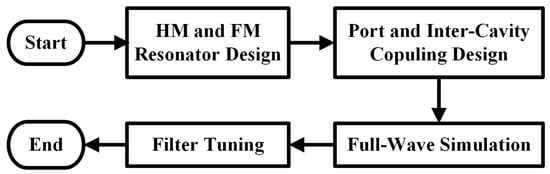 The HM dielectric-filled resonator can be cascaded with the FM resonator to design bandpass filters (BPFs). The design approach is similar to that of traditional cavity filters [21,22,23,24]. Figure 6 shows the design process of the bandpass filter. The design of the HM dielectric-filled resonator was completed in the previous section. The FM dielectric-filled resonator can be designed using traditional methods. This section will complete the port coupling and inter-cavity coupling design. The full-wave simulation and tuning of the filter are carried out using HFSS and CST Filter Designer 3D, respectively. These two processes are not elaborated upon here.