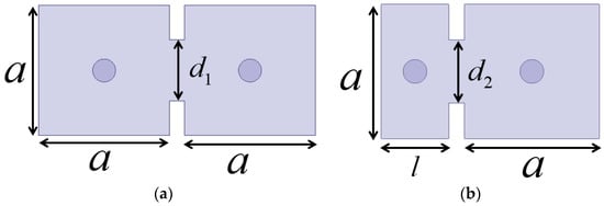 To ensure the proper functioning of the HM dielectric-filled resonator, the inter-cavity coupling avoids the VMW and adopts conventional iris coupling methods. Figure 8a illustrates the coupling configuration where both cavities are FM resonators, while Figure 8b depicts the coupling configuration between an FM resonator and an HM resonator. The sizes of the coupling irises and determine the magnitude of the coupling coefficient. The coupling coefficient of the inter-cavity can be defined as follows [27]: