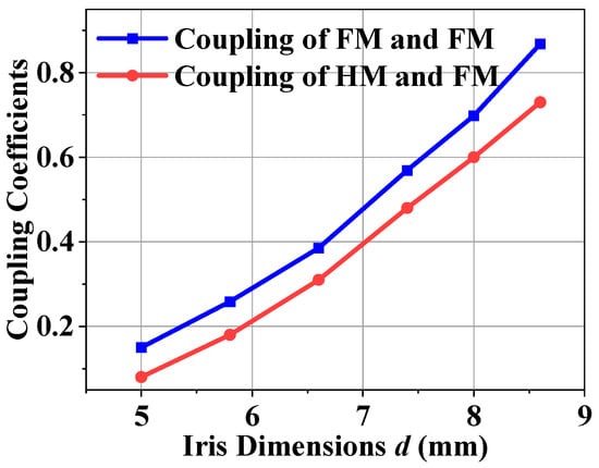 Figure 9 shows the inter-cavity coupling coefficients as a function of iris dimensions. Inter-cavity coupling is achieved through an iris in an electric wall iris to ensure the proper functioning of the VMW in the HM resonator. The blue curve represents the coupling between two FM resonators, while the red curve corresponds to the coupling between an FM resonator and an HM resonator. The results indicate that the coupling coefficient increases as the iris dimensions grow for both cases. However, the coupling strength for FM-FM resonators is consistently higher than that for FM-HM resonators across the entire range of iris dimensions.