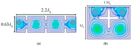 Figure 10 illustrates the configuration and top-view electric field distribution of the simulated fourth-order inline and folded BPFs. The dimensions of both filters are indicated in waveguide wavelengths () in Figure 10, with the height of both the inline and folded filters being . In both filter configurations, port coupling is realized using a coaxial probe connected to the HM resonators. The connection between resonator 1 and resonator 4 in the folded BPF ensures structural integrity and remains deformation-free throughout the manufacturing process.