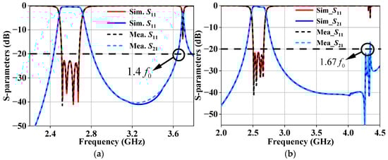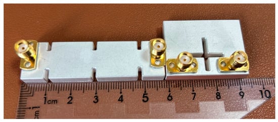 Figure 11 presents images of the fabricated inline and folded BPFs. SMA connectors are used to facilitate port coupling via a welding technique. The frequency responses, including both simulated and measured data, are shown in Figure 12. Both the inline and folded BPFs exhibit approximately symmetric responses with a center frequency of 2.6 GHz and a bandwidth of 160 MHz. The simulated and measured frequency response curves demonstrate excellent agreement, with the passband of the BPFs ranging from 2.515 GHz to 2.675 GHz. The in-band return loss of the inline BPF is 22 dB for both simulated and measured results, while the minimum insertion loss is 0.5 dB for simulation and 0.7 dB for the measurement. Out-of-band suppression of the inline BPF reaches 20 dB at 1.4. Similarly, the in-band return loss of the folded BPF is 22 dB for the simulation and 20 dB for the measurement, with a minimum insertion of 0.6 dB for the simulation and 0.8 dB for the measurement. Out-of-band suppression of the folded BPFs reaches 20 dB at 1.67. Both the inline and folded filters exhibit a volume reduction of approximately 20% compared to the full-mode filter. This design offers flexibility in dimensional design and can be used in scenarios with specific size constraints, reducing the size without compromising the filtering performance.