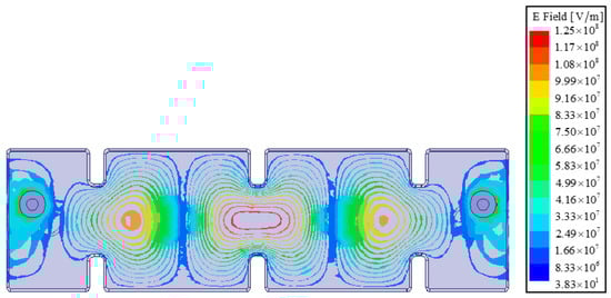 The inline filter exhibits parasitic behavior at 3.7 GHz, whereas the folded filter does not show parasitic behavior at 3.7 GHz. This study explains the above phenomena using the eigenmode method. Figure 13 illustrates the electric field distribution of the spurious mode at 3.69 GHz in the inline filter, while Figure 14 shows the electric field distribution of the same spurious mode at 3.76 GHz in the folded filter. The field strength of the spurious mode is higher at the ports of the inline filter, leading to parasitic behavior. However, the field strength of the spurious mode is lower at the ports of the folded filter, preventing spurious behaviors.
