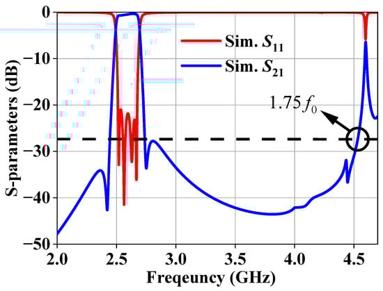 Frequency response of the simulated fourth-order folded dielectric-filled bandpass filters with two transmission zeros.