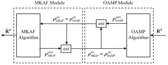 Based on (6), we propose a Turbo-CCC algorithm consisting of two modules. Specifically, the OAMP module corresponds to the conditional probability and the MKAF module corresponds to the conditional probability . The structure of the algorithm is shown in Figure 2.