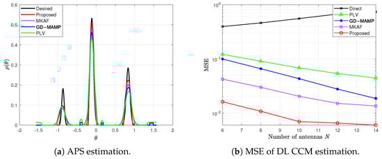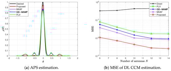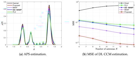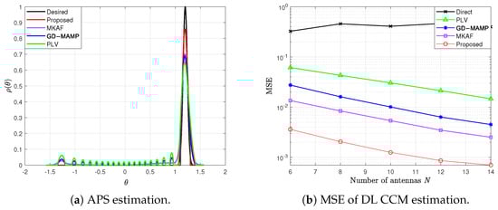 - MKAF algorithm in [35]: This algorithm models the APS using Gaussian kernels, directly updating the parameters of the kernels based on the UL CCM, and reconstructs the DL CCM according to the estimated APS.