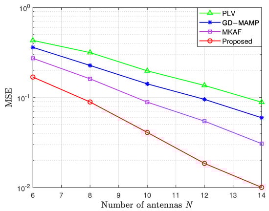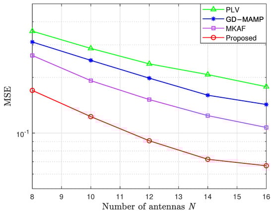 MSE performance of APS estimation with different numbers of antennas N under ideal channel model.