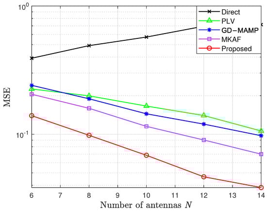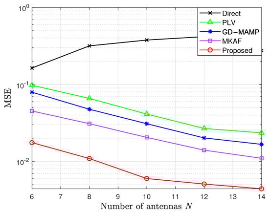 Figure 8 shows the MSE performance of DL CCM reconstruction under different numbers of antennas N. The results are also based on 100 realizations of diverse APS distributions. To highlight the performance of various algorithms, we also included the performance of direct UL-DL CCM conversion. Similar to the observation in Figure 7, the performance of all algorithms improves with an increase in the number of antennas. The performance of the proposed algorithm is generally better than the other three algorithms. This is expected, as the proposed algorithm makes full use of the sparsity and structural characteristics of the APS, resulting in a more accurate estimation of the APS, and consequently, a more accurate reconstruction of the DL CCM.