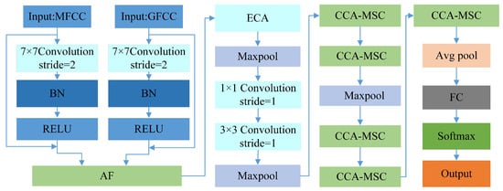 The network architecture adopts a dual-input branch design, receiving MFCC and GFCC features separately. Both branches initially pass through residual-connection-based feature extraction modules to generate two types of feature maps. These feature maps are then input into the AF module for fusion. The fused features undergo the ECA channel attention mechanism, further highlighting the channel importance of the fused features. The feature maps processed by the ECA mechanism sequentially pass through max pooling, 1 × 1 convolution, and 3 × 3 convolution operations (all with stride 1), followed by another max pooling layer. Subsequently, they enter a series of CCA-MSC modules. The multi-scale feature extraction module (MSC) primarily aims to extract features at different scales and abstraction levels from feature maps, enhancing the network’s comprehension and representation capabilities of targets. By introducing the cross-channel attention mechanism in the MSC modules, the feature expression capability is effectively enhanced. After feature enhancement through the CCA mechanism, the network completes final feature processing and classification output through average pooling, fully connected layers, and Softmax activation function. The network structure is illustrated in Figure 1.