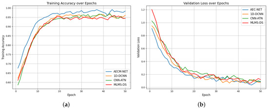 For the deep-learning-based methods, we further analyzed their performance changes during the training process, as shown in Figure 12. Since the ML-based method [39] using SVM and the Skinny pattern method [40] using random forest classifier are traditional machine learning techniques without epoch-based iterative training processes, Figure 12 only presents the training accuracy and validation loss curves for the four deep learning methods. From Figure 12a, it can be observed that our proposed ACEM-Net method consistently maintains higher accuracy throughout the training process and converges faster than the other two methods; Figure 12b shows that ACEM-Net’s validation loss decreases more rapidly and stabilizes better, indicating superior generalization capability.
