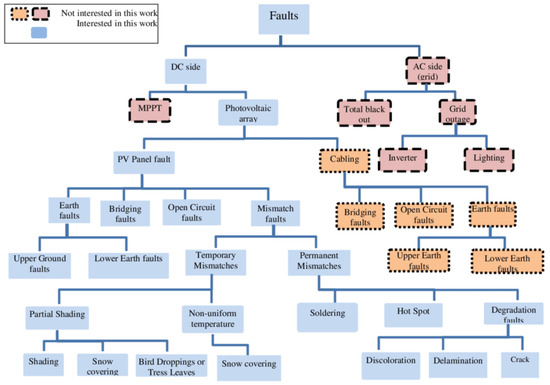 To predict the occurrence and effects of faults in photovoltaic (PV) systems, a comprehensive classification divides these issues into DC-side and AC-side faults [19]. AC-side faults are primarily associated with inverters or the power grid, whereas DC-side faults encompass a range of issues, including Maximum Power Point Tracking (MPPT) algorithm errors, as shown in Figure 2, bypass diode failures, ground faults, arc faults, cell or module mismatches, open circuits, and short circuits. Among these, the most prevalent faults—short circuits, open circuits, and module mismatches—warrant detailed examination [9]. Open-circuit failures are particularly detrimental, as they disrupt the electrical current flow, potentially impacting individual module strings or the entire system, depending on the fault’s location and the PV system’s configuration [20]. Module mismatches occur when the electrical properties of cells or modules vary significantly, thereby reducing system performance [21]. These mismatches can be classified as permanent, resulting from degradation or physical damage, or temporary, caused by external factors such as snow, dust, or shadowing from nearby structures or transmission lines.