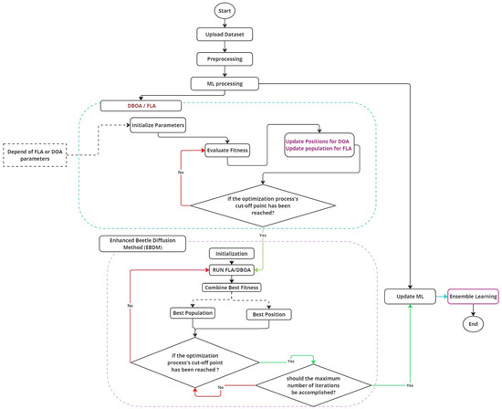 DBOA and FLA workflow shown in Figure 5 use straight-line movement and solution quality-based adaptive changes to explore the search space. This aids complex optimization landscapes like machine learning parameter adjustment. The integrated update is designed as follows: