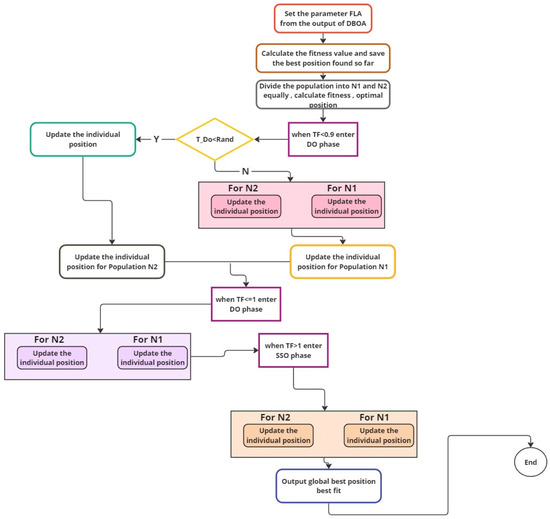This equation signifies that the new solution uses DBOA to discover the best solution, then uses FLA to fine-tune the approach depending on local solution densities for global search and local precision. This hybrid technique aims to identify several solutions while searching in attractive areas to improve optimization results in fewer rounds.