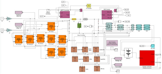 The simulation was conducted in MATLAB r2024a and Simulink 2024 on an MSI EvoBook 16, equipped with an Intel Core i7-1260P processor (12 cores, 16 threads, up to 4.7 GHz), 16 GB LPDDR5 RAM, a 1 TB NVMe SSD, and integrated Intel Iris Xe graphics. The photovoltaic (PV) system was modeled with 14 PV modules, each rated at 250 W, arranged in a series-parallel configuration with seven modules per string and two parallel strings, providing a total maximum power output of 3.5 kW under standard test conditions (irradiance of 1000 W/m2 and module temperature of 25 °C). The PV array output was regulated by a buck–boost converter, which adjusted the voltage (ranging from 150 V to 300 V) to supply a set of typical household loads distributed across three AC buses. The load configuration included resistive and dynamic loads such as lighting (1.2 kW), a refrigerator (300 W), an HVAC system (2 kW), and miscellaneous appliances (500 W). Each bus operated at 230 V AC with a frequency of 50 Hz, connected via a load-balancing mechanism to ensure stable power distribution. A 48 V lithium-ion battery with a capacity of 200 Ah and a depth of discharge of 80% was integrated into the system to store excess energy and provide backup during periods of low irradiance or high shading, as shown in Figure 6.