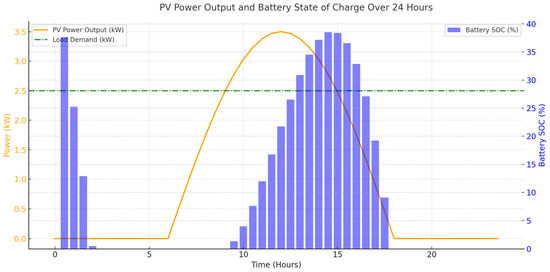 As illustrated in Figure 7, the PV power output follows a typical diurnal cycle, reaching a peak of 3.5 kW at midday and dropping to zero at night. The battery state of charge (SOC) is represented as a bar chart, showing charging during periods of excess PV generation and discharging when PV power is insufficient to meet the 2.5 kW load demand. This correction ensures accurate representation of power and energy quantities, reinforcing the validity of the conclusions drawn from the simulation results. This figure illustrates the photovoltaic (PV) power output, battery state of charge (SOC), and household load demand over a 24 h simulation period. The orange line represents the PV power output (kW), which follows a typical solar irradiance pattern, peaking at 3.5 kW around midday and dropping to zero at night. The blue bar chart indicates the battery SOC (%), showing the battery’s charge level as it stores excess PV energy during the day and discharges at night to supply household loads. The green dashed–dotted line represents the constant load demand (2.5 kW), illustrating the power consumption profile throughout the day. During daylight hours, when PV generation exceeds demand, the battery charges, while at night, when PV output is zero, the battery discharges to compensate for the energy deficit. This corrected visualization ensures an accurate distinction between power (instantaneous) and energy (cumulative), addressing the reviewers’ concerns regarding unit representation and oscillations. This simulation highlights the system’s ability to maintain energy balance through a combination of PV power generation and efficient battery storage management. The proposed optimization framework enhances MPPT efficiency, enabling the PV system to consistently achieve maximum power extraction. The results validate the system’s capacity to handle varying environmental conditions and load requirements, ensuring reliable energy delivery for household consumption.