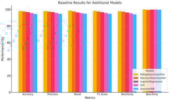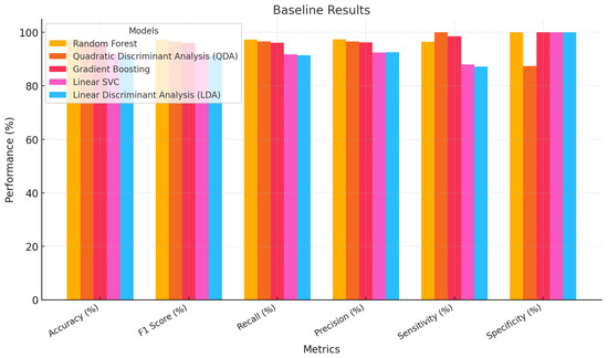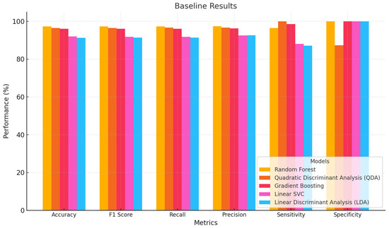 Quadratic Discriminant Analysis performed well with 96.43% accuracy and 96.61% precision. Its sensitivity was 100%, but its specificity was 87.37%, showing its significant difficulties avoiding false positives. Gradient Boosting functioned well with 96.07% accuracy, 96.05% F1 score, and an identical recall rate. This model had 96.23% precision, 98.57% sensitivity, and excellent specificity. Linear SVC improved to 94.29% accuracy and a 94.26% F1 score. This model’s precision climbed to 94.85% and its recall matched its accuracy. Linear SVC’s 85% sensitivity limited its ability to detect all positive cases, but it had 100% specificity.